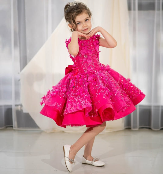 Girls Hot Pink Birthday & Party Dress – 3D Floral Appliqué, Sparkly Tulle, Bow Back, Short Sleeve