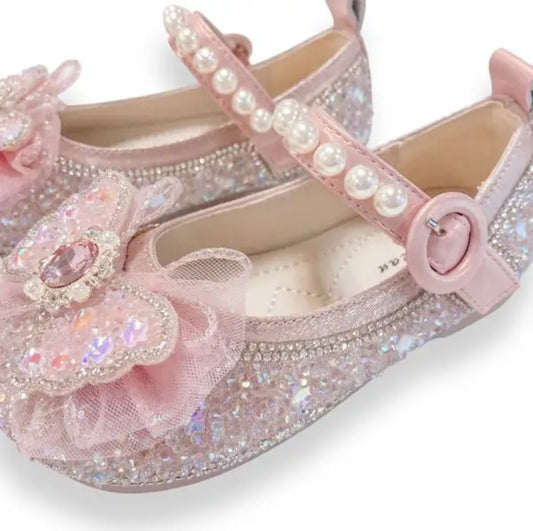Big Girls sparkly pink Bow Dress shoes Glitter $ Pearl Strap