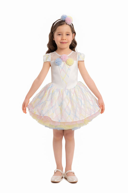 Pastel Rainbow Tutu Dress for Girls – First Birthday Party Outfit with Pom Pom Accents
